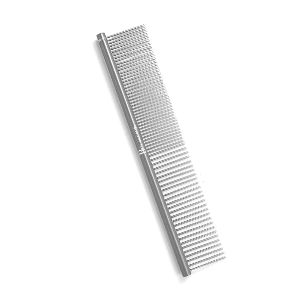 El peine de acabados plateado es una herramienta profesional fabricada en acero inoxidable con recubrimiento cromado, lo que garantiza resistencia, durabilidad y un aspecto elegante. Gracias a su ligereza, reduce la fatiga en sesiones prolongadas y facilita el control y la precisión en el trabajo. Utilizado en la fase de terminación del grooming, este peine asegura un resultado pulido y profesional, ideal para salón o competencia. No se recomienda para desenredar, ya que podría dañar las púas, las cuales están diseñadas específicamente para batidos y acabados finales en los cortes.