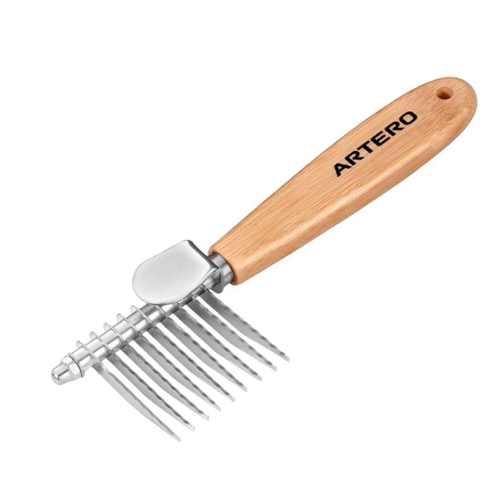 Peine desmotador de acero inoxidable, ideal para pelajes gruesos, largos y densos. Cuenta con hojas reversibles que permiten su uso tanto para personas diestras como zurdas. Su agarre cómodo y ergonómico se adapta fácilmente a la mano, ayudando a prevenir la tensión en la mano y la muñeca durante el cepillado.